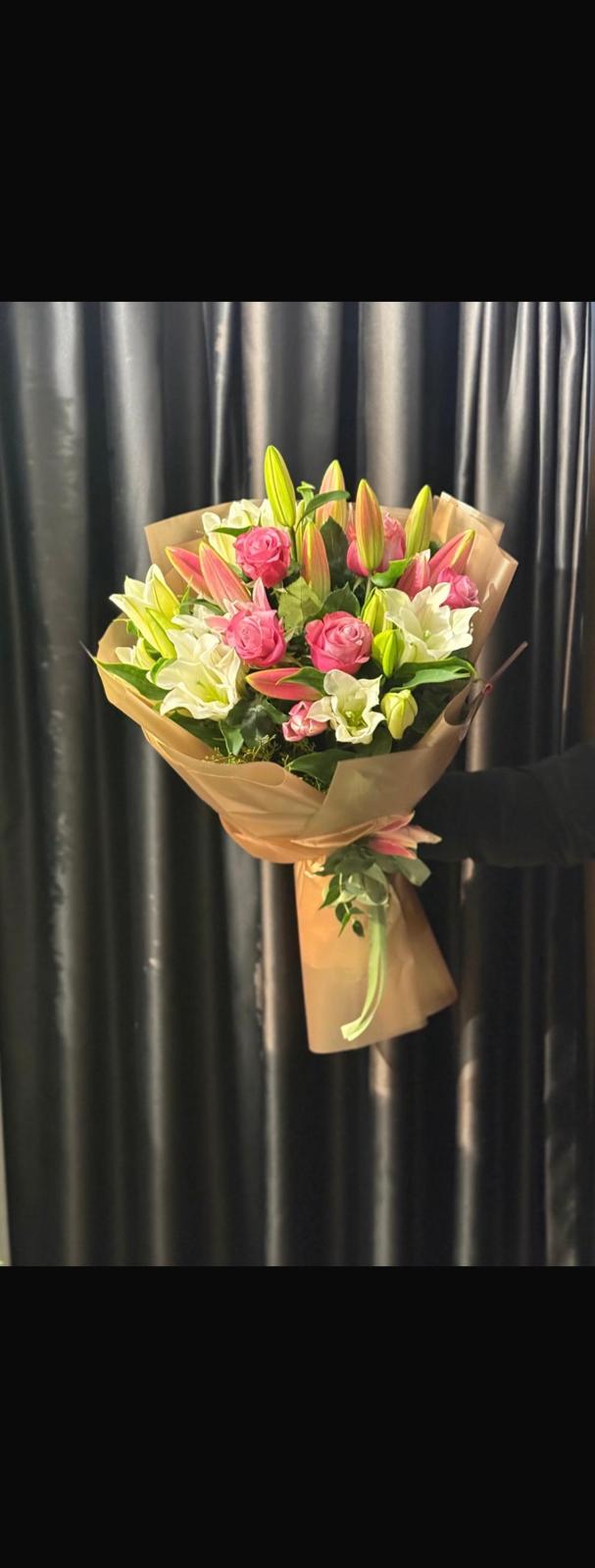 3 Beyaz Lilyum, 3 Pembe Lilyum ve 5 Pembe Gül Buketi, zarafetin ve romantizmin en üst segment aranjmanlarından biridir. Lilyumların (zambak) görkemli yapısı ve baskın kokusu, pembe güllerin narin dokusuyla birleşerek tam bir “saray bahçesi” havası yaratır.